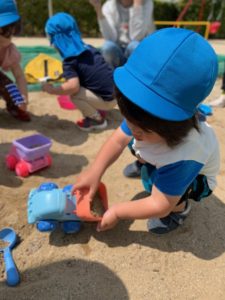 今日は公園の砂場で砂遊び♪スコップやバケツで何を作っているのかな?
