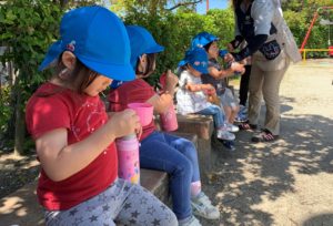 でも遊ぶ前に、みんなで木陰に座って水分補給しましょう。