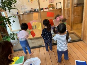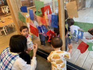 その後は、余ったお花紙を窓に貼り付けて遊びました。