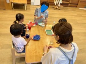 そんな日に園では、ペットボトルの中の水に、色んな色のお花紙を入れてカラフルなジュースを作りました。