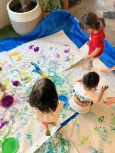 藤が丘にじのこども保育園では、涼しいウッドデッキで、フィンガーペイントをしました。