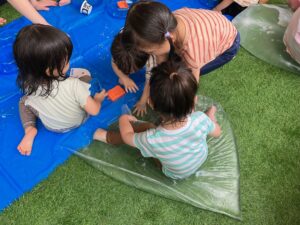 また別の日は、大きなビニール袋に水を入れて、ウォータークッションにして遊びました。