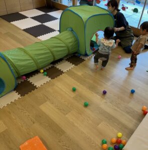 テントやトンネルの中を行ったり来たりしてみたり、カラーボールを投げてみたり…♪